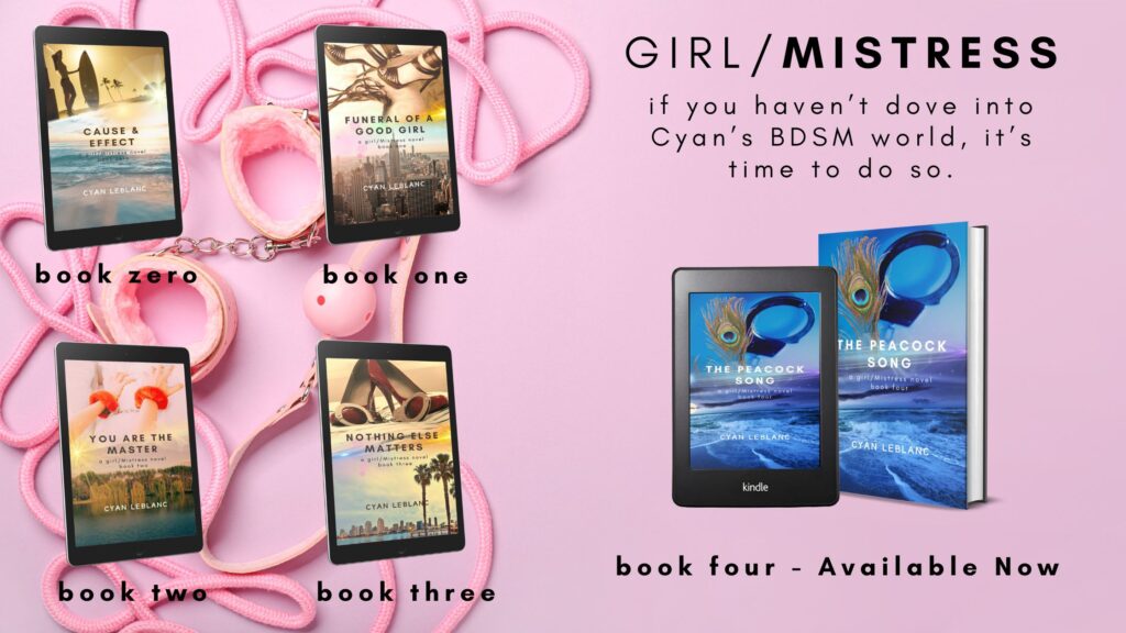 It’s finally available… THE PEACOCK SONG, book four of the girl/Mistress series. I’ve had a rough start to 2024 but it seems like the writing world is coming back together.