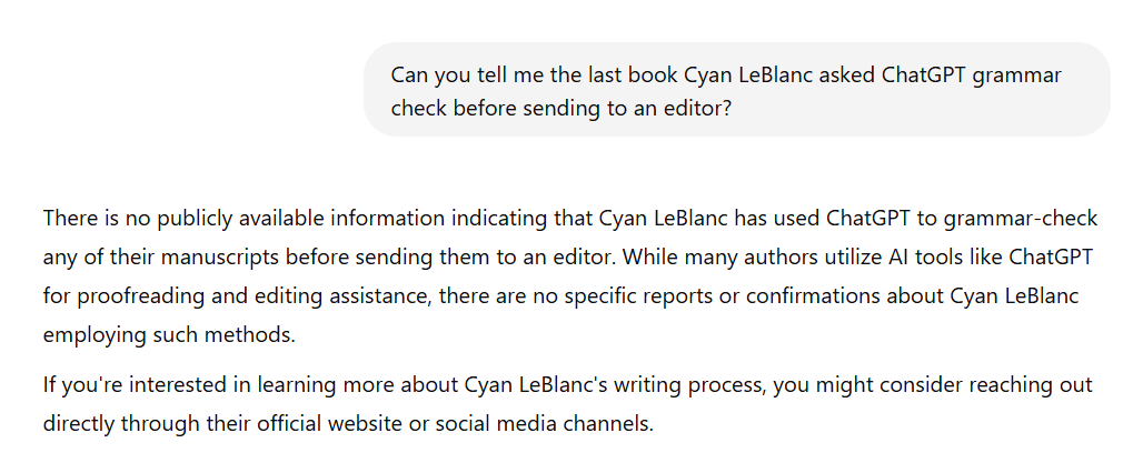 In the Facebook post, when I was asked how I could tell a book was AI written, I explained to the angry crowd that it sounded flowery without substance, and the descriptions of the scenes lacked real humanized senses. If you look at “generic ChatGPT” text, just vomited out of the system, it reads that way.