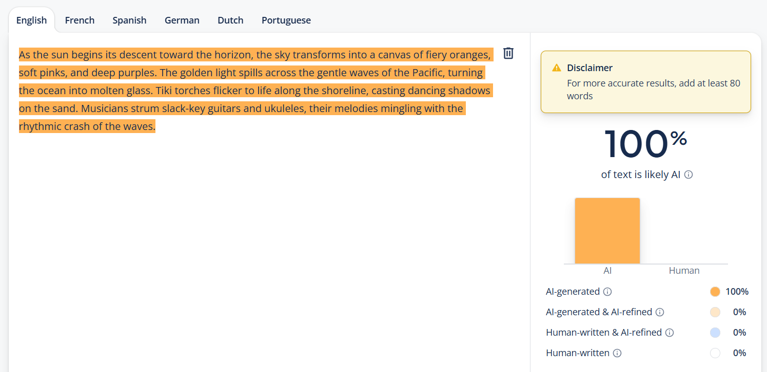 Not every AI-written piece dropped in a AI-Detector will show as 100%, sometimes it comes out as 50% or even 0%. It’s is not perfect, at all. But if I read the Hawaiian beach luau in someone’s book, and I drop that in a checker and it comes back, I am going to ASSUME it is written with AI. Maybe not the entire book, I don’t have the time and effort to upload an entire book and check.
